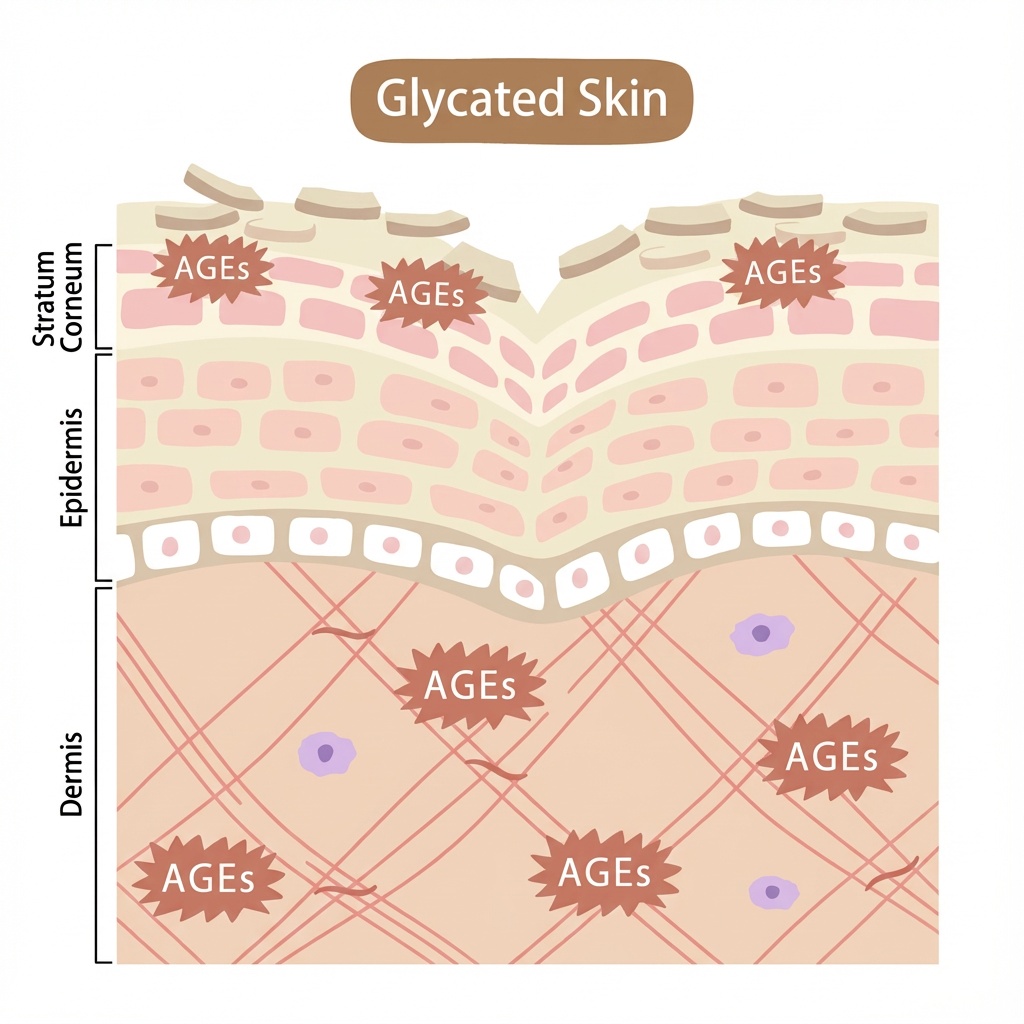Advanced Glycation End-products (AGEs) are harmful compounds formed when excess sugar binds to proteins in the body. As glycation increases, it accelerates visible skin aging, impairs organ function, and elevates the risk of lifestyle-related diseases.